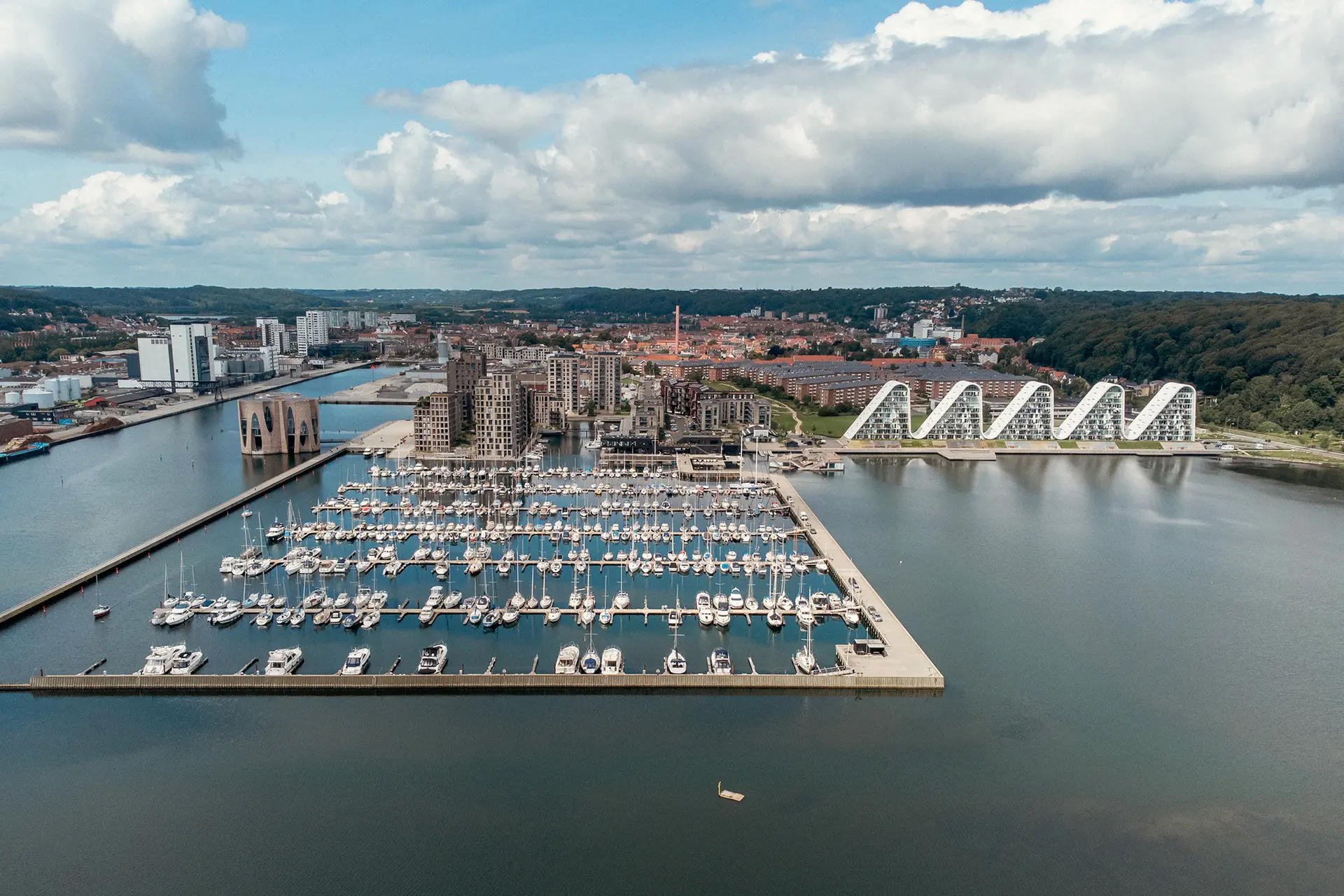 AE Interests: High-rise condominium with nature present throughout the ground floor. Large arcs carve into the building according to the view corridors of adjacent buildings. These cutouts reveal the wood pattering beneath and give immediate access to outdoor spaces for every unit. Vertical facades made of glass, opaque aluminum, and grille panels reflect and filter the Pacific Northwest light.