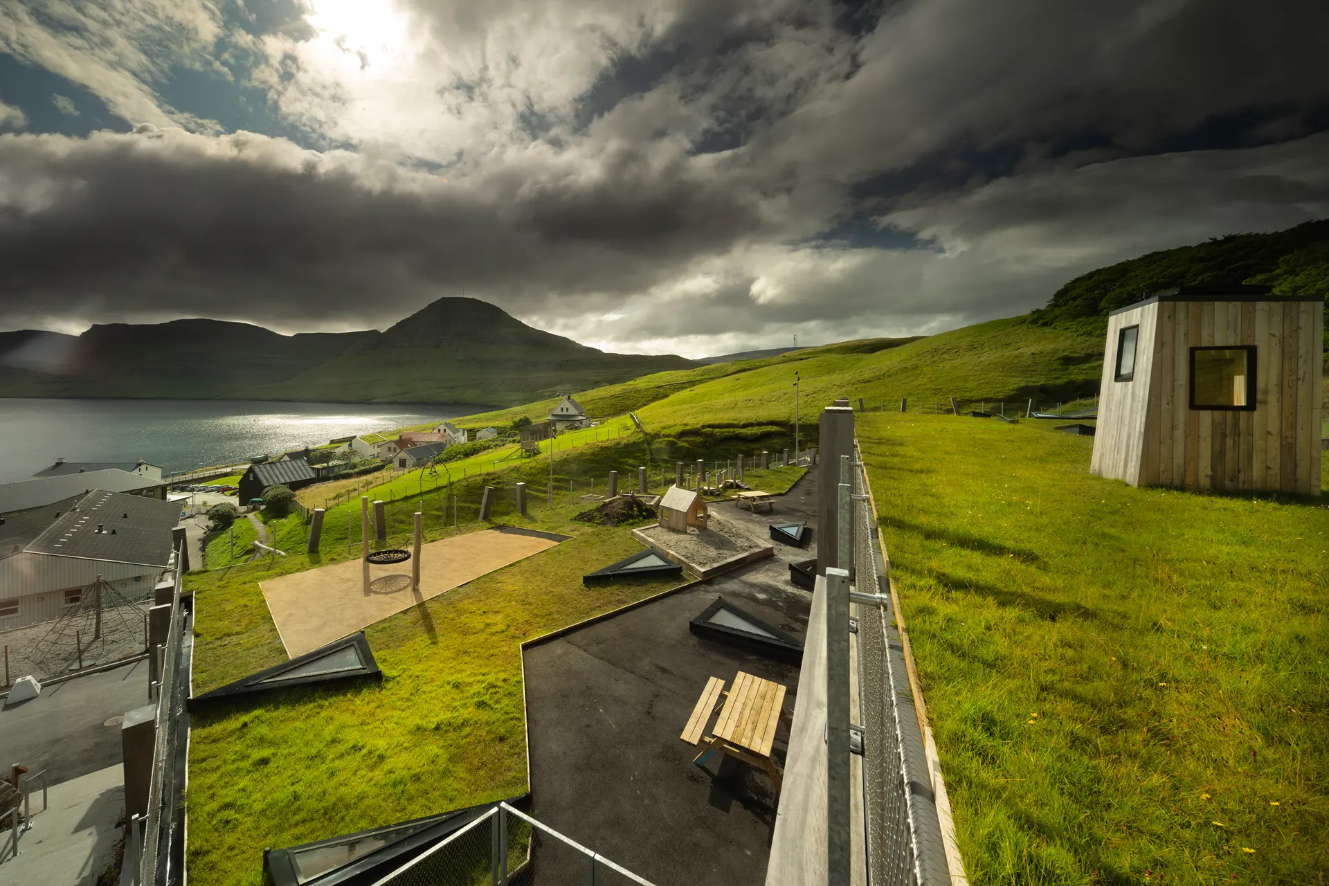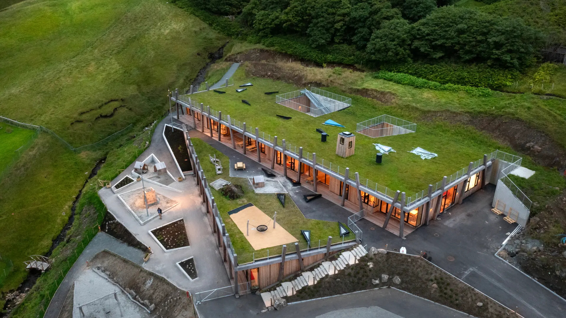 AE Interests: Weathering steel roof, use of solar panels, wings of roof catch rainwater, open-air, perforated metal and wooden walls, educational and historical use