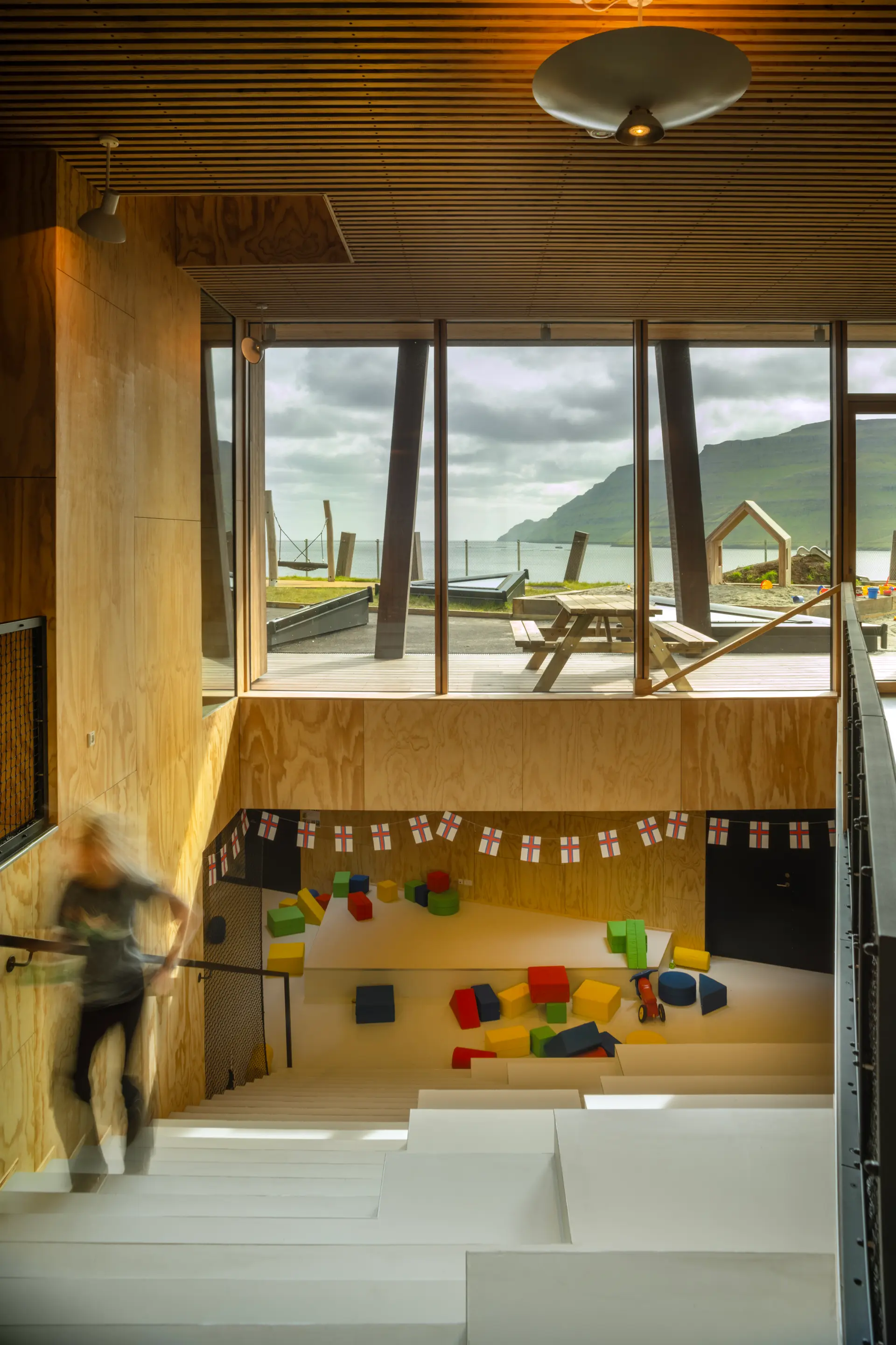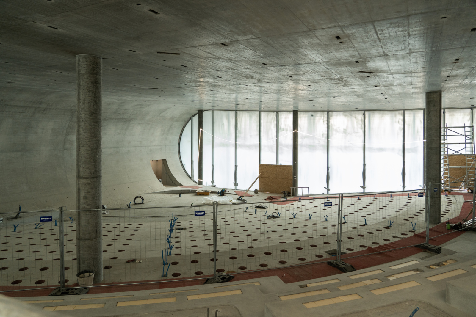 AE Interests: The roof is a single 12 mm steel plate supported only by four 250 mm exterior walls, reinforced by rib-like compression rings, and spanning roughly 90 meters above a floor that rises five meters from end to end. Its height ranges from 2.2 to 2.8 meters—similar to typical Japanese housing—and 59 rectangular roof openings bring daylight into the space.