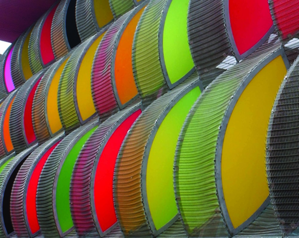 AE Interests: opal polycarbonate roof cladding, galvanized steel frame, stainless steel mesh walls.