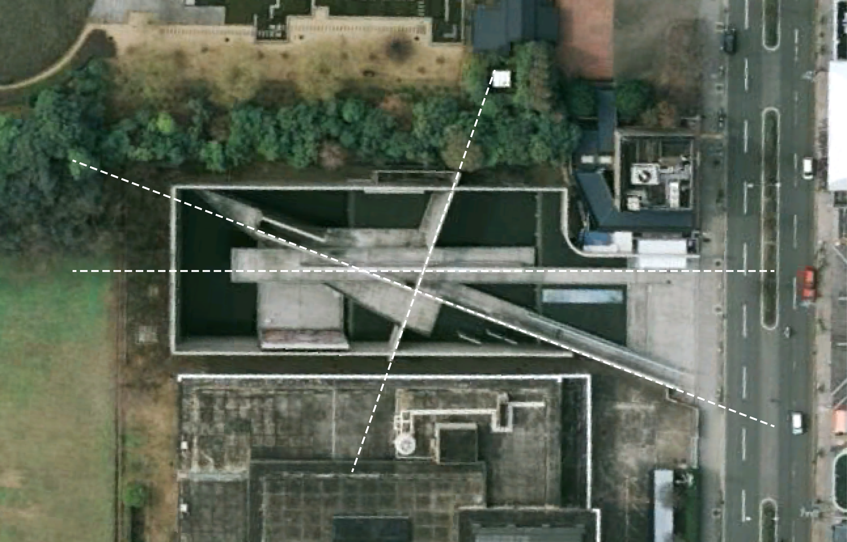 AE Interests: described as “a contemporary and volumetric version of a stroll garden”; very open; large concrete beams on massive pillars, overlapping bridges and ramps, walls of falling water and pools with paintings that are floating on the surface of the water