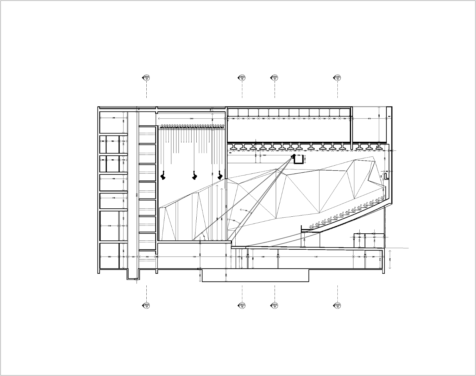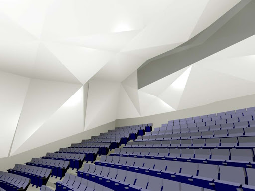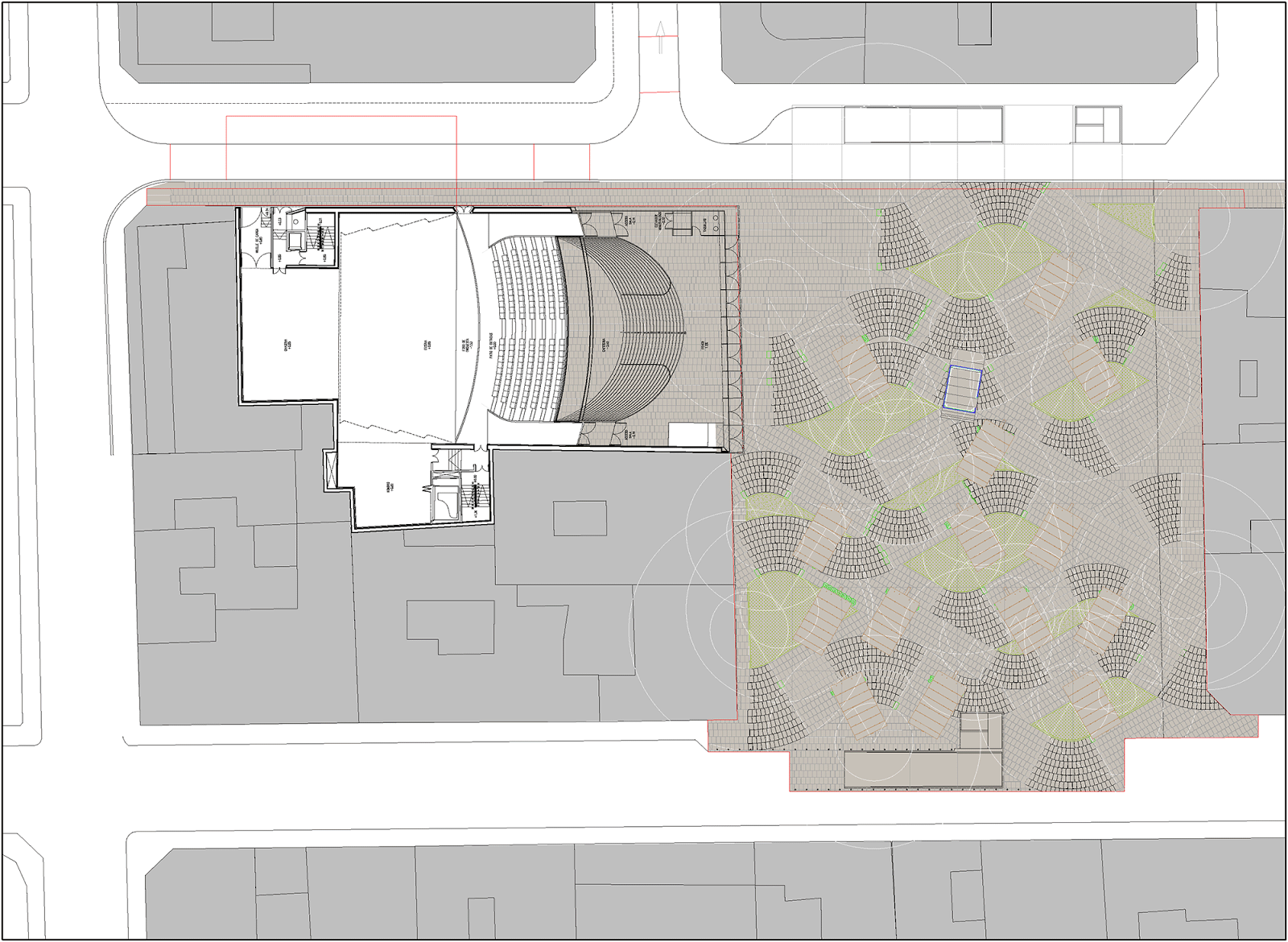 AE Interests: Plaza sits under cantilevered mass of the building, designed as single container to remove the proscenium