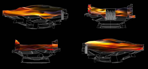 AE Interests: The theatre itself is supported 15m above ground by just 6 columns and 3 stairwells and contains no parallel lines.