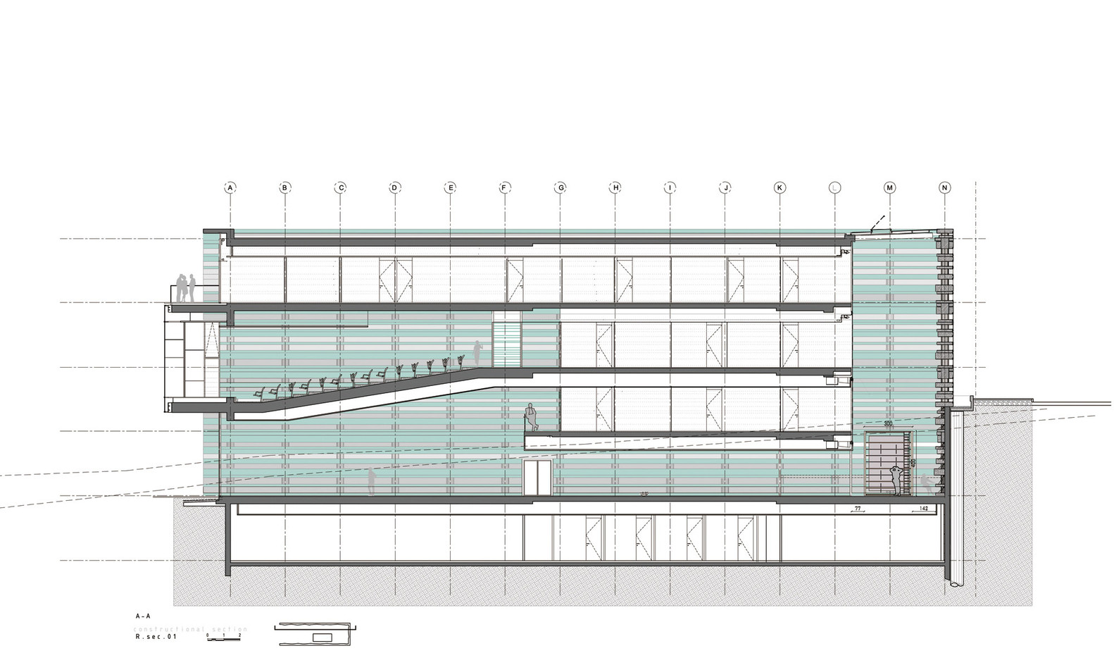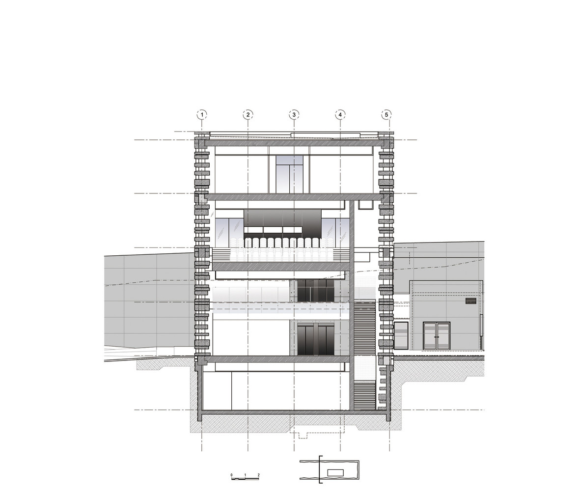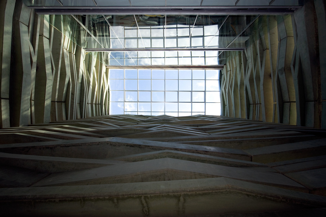 AE Interests: the parallelpiped building is created by the layering of various shaped glass and concrete placed on a monolithic base