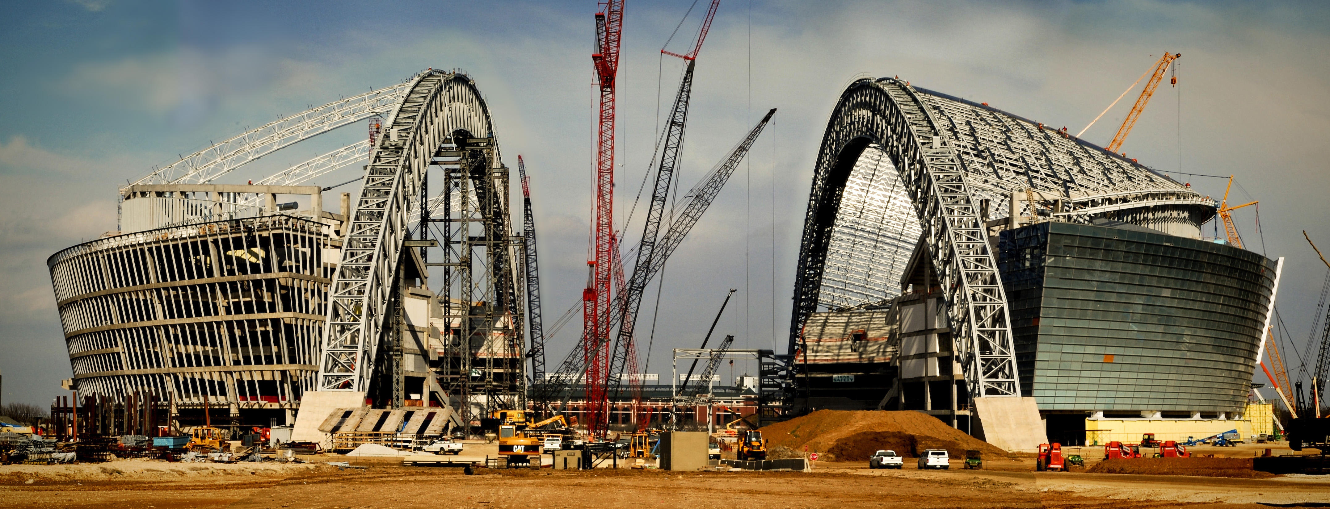 The stadium of NFL’s Dallas Cowboys was the largest dome in the world, until the Singapore National Stadium was completed in June 2014. The roof has an area of 660,800 square feet with the highest point at nearly 300 feet above the field. The stadium is centered about two main steel arch box trusses, anchored to the ground on each end lying 1,225 feet apart. Two of the large panels connecting these trusses are retractable, creating an opening of 104,960 square feet in twelve minutes. The world’s largest operable glass doors are located at each end zone of the stadium, spanning 180 feet wide and 120 feet high.