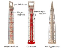 AE Interest: Three primary structural systems, mega structure includes main corner columns and smaller perimeter columns, corner columns composites with steel and concrete, reinforced concrete core connected to mega structure through outrigger trusses, lateral stability accomplished through diagonal columns on mega structure and service core shear walls, additional service lateral stability form two 150 ton dampers on 90th floor, structure designed to minimize obstruction of views from office space, large keyhole in the structure decreases wind load on building, designed to withstand typhoon level wind loads