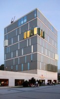 AE Interests- Tall slit windows, arranged in an apparently random fashion, allow in natural light. The interior walls are covered in abstracted text in different colors. Structure is confined to the core and perimeter to leave a largely column-free interior.