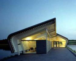 AE Interests: international cultural pavilion situated on a narrow peninsula, comprised of wood, glass and metal cladding, supports a three-hinged frame roof system, similar to those used in local barns, identical trusses are situated at different angles resulting in a shifted roof which provides indirect lighting.