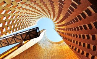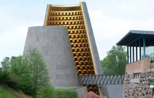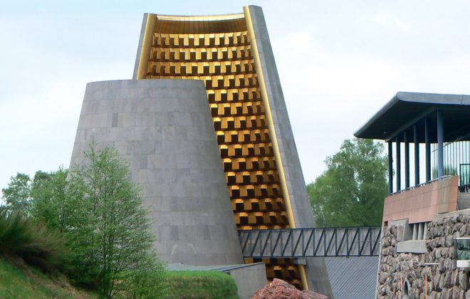 AE Interest: hollowed out from flows of basaltic lava, only the main peak is visible about ground, interior lined with gold shimmering stainless steel scales for aesthetics and to provide light to the foyer, Hans Hollein won an International Competition for the design in 1994