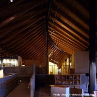 AE Interests: Reinforced concrete and steel plus laminated wood roof framing. Large canopy provides sun shading efficiency. Deciduous trees planted next to external air intakes precools air before it enters the building.