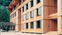 AE Interests: large scale wood structure, prefabricated elements create skeletal frame, shear and lateral forces on large windows is taken up by solid panels between frames