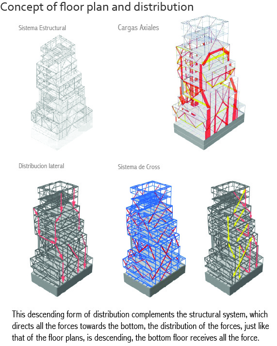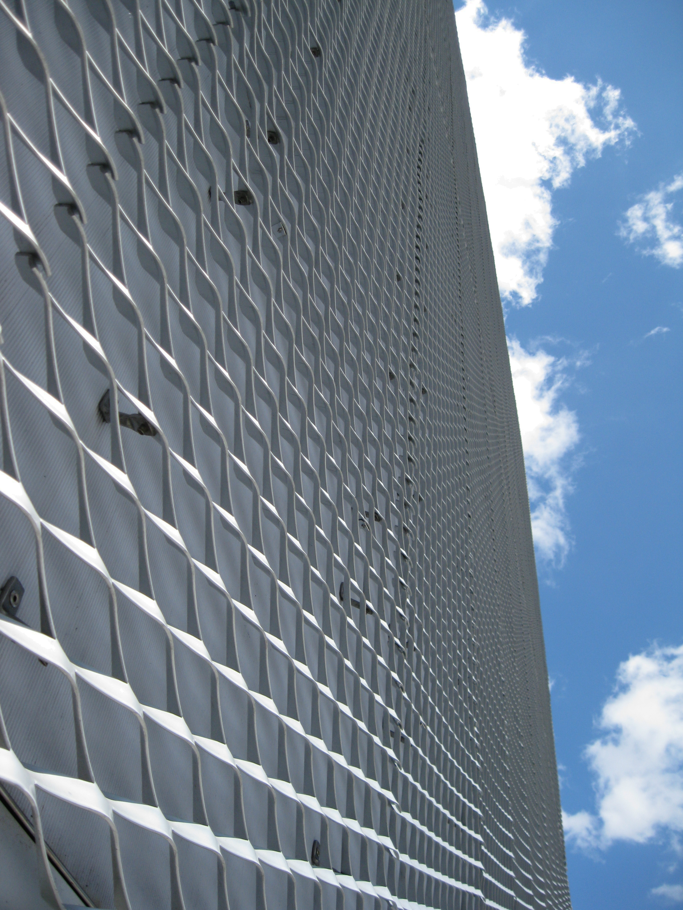 AE Interests: Staggered box structural scheme, Exterior cladding: expanded metal mesh on corrugated aluminum panels. `