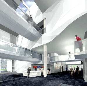 AE Interest: 3-story atrium with 5 bridges, limestone walls and large glass boxes
