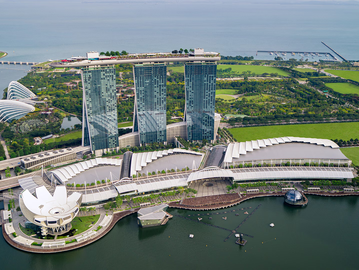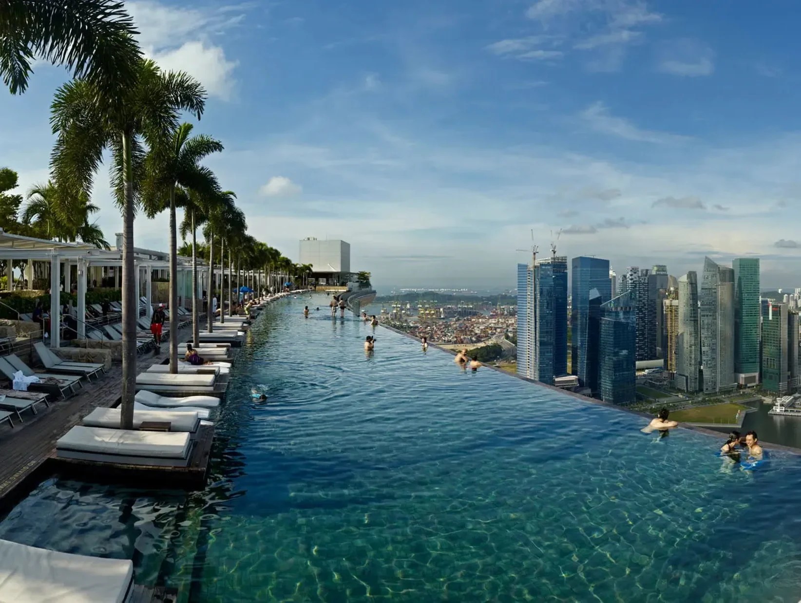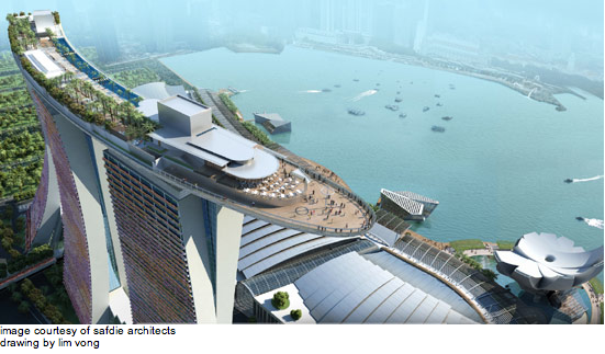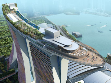 AE Interests: curved towers, giant cantilevered SkyPark (world’s longest public cantilever), 150-meter long roof-top swimming pool with infinity edge. The rooftop superstructure sits 200m high, straddling three 55-story luxury hotel towers.
