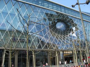 AE Interest: Amorphous roof landscape, fully glazed main facade with an inward trumpet-formed deformation. Glass-and-steel translucent skin envelops and deforms the entire building.