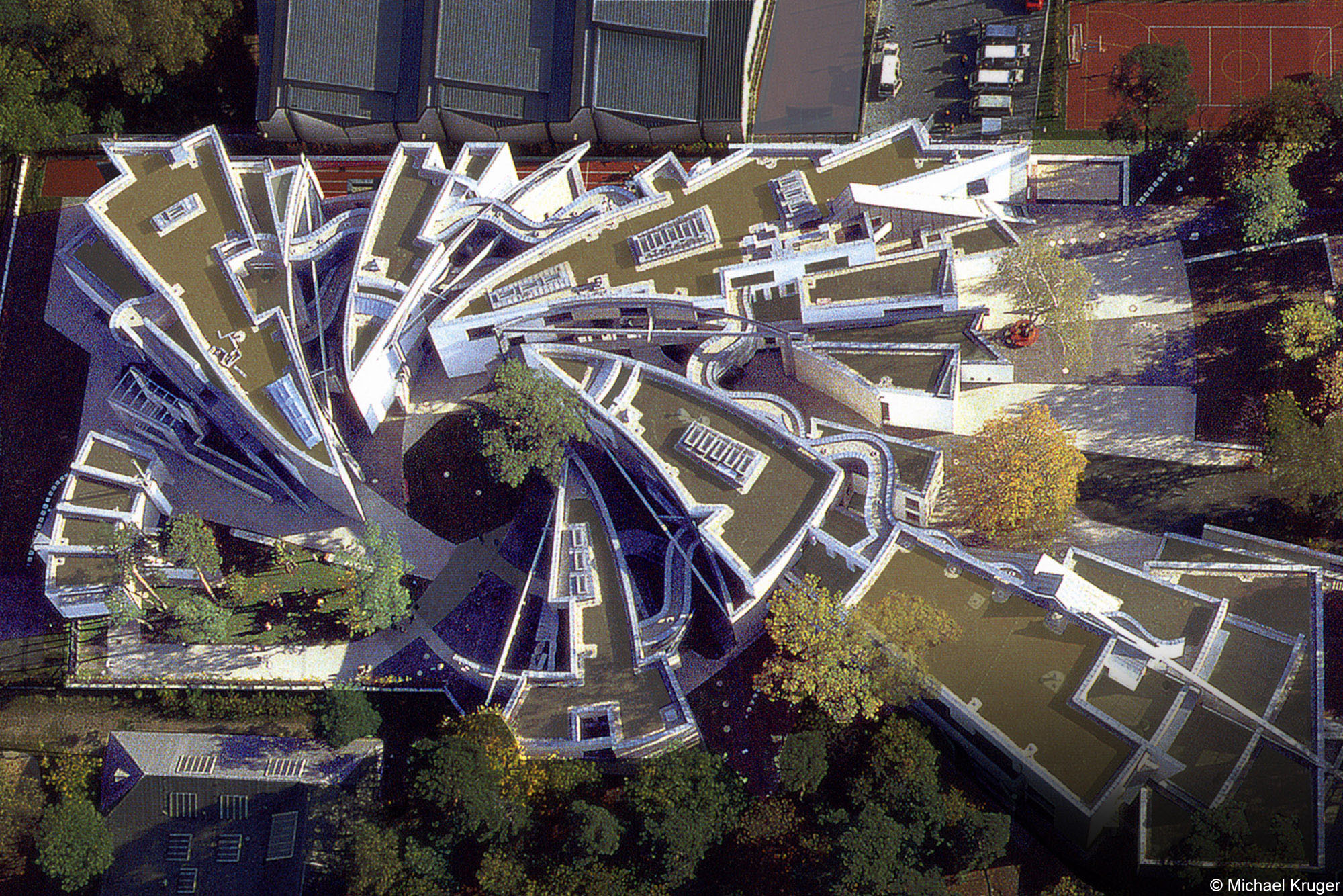 AEInterest: “sunflower” shape as each petal forms a classroom; no parallel walls allow building to capture sunlight; consists of painted stucco, concrete, and corrugated aluminum