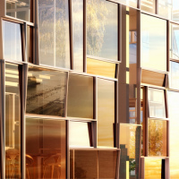 AE Interests: Curtain wall contains over 1,650 individual glass panes, all sized, shaped, and angled differently, LEED certified, the curtain wall captures daylight differently throughout the day and the year