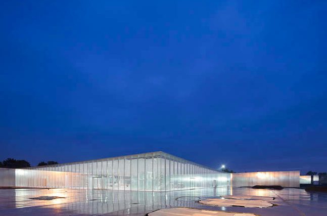 AE Interest: Five low, curving pavilions compose main structure; roof made up of glazed, angled louvers; large brushed aluminum panels alternating with clear glass reflecting panels to create facade; transparency to incorporate environment
