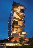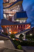 AE Interest: Angular in shape, mainly glass facade, timber-clad boxes slotted into the glass facade will provide decked balconies, floors intertwine with one another, a network of social and study spaces distributed across oversized landings along an intricate 14-story stair.