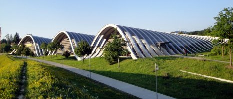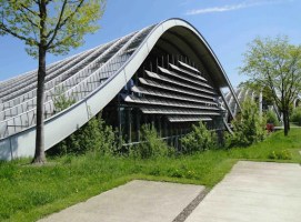 AE Interest: Bold curvilinear design; has studios for art education, a 300-seat auditorium for concerts, and a library; arches are made out of bent steel that dig into the earth; amount of natural light going into the building is controlled by exterior blinds; roof was soldered by hand