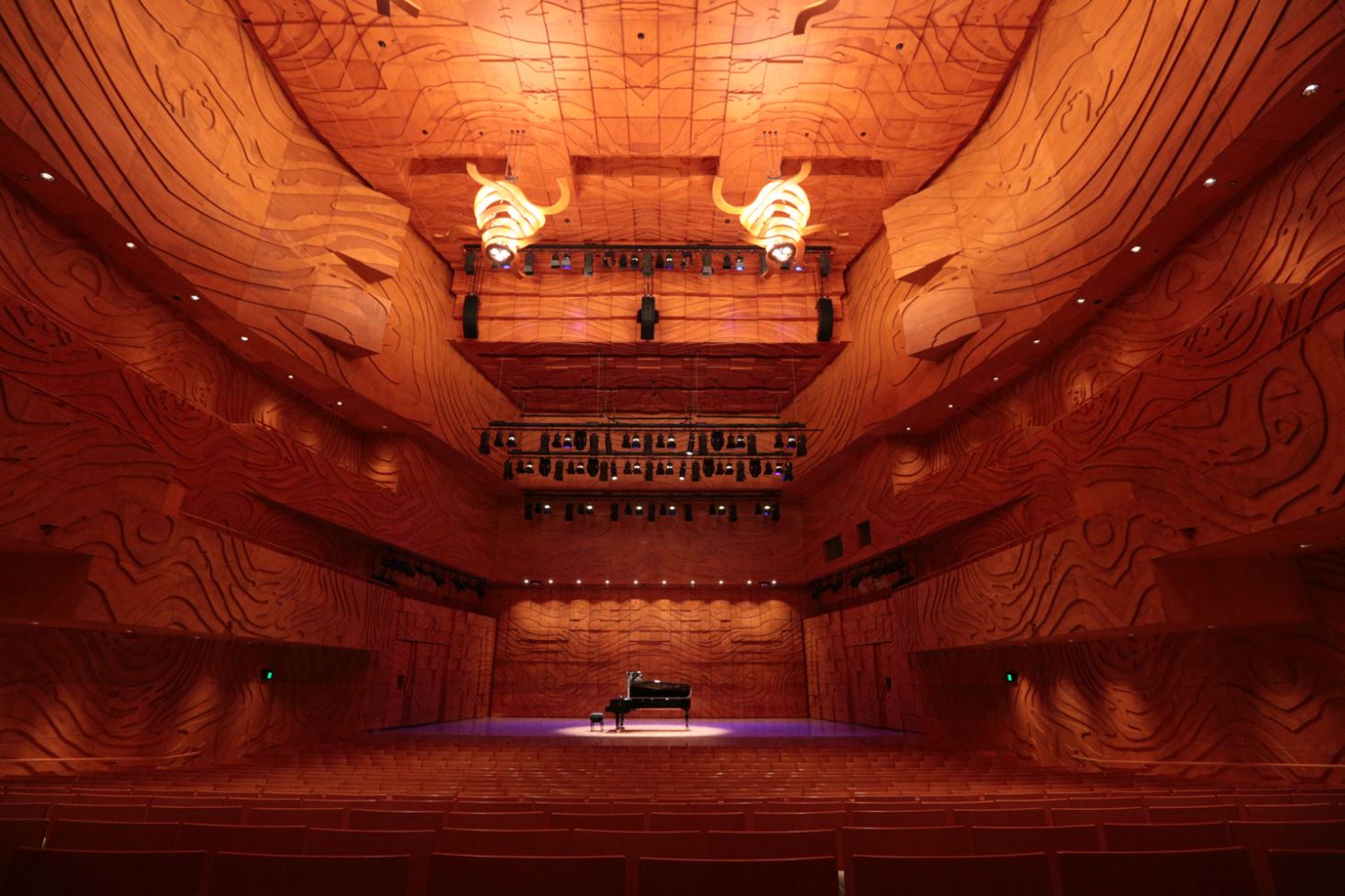 AE Interests: World-class acoustic design; Interior clad in Australian hoop pine; Interior paneling provides reflective ledges and sound diffusions; “Box-in-box” arrangement reduces outside noise