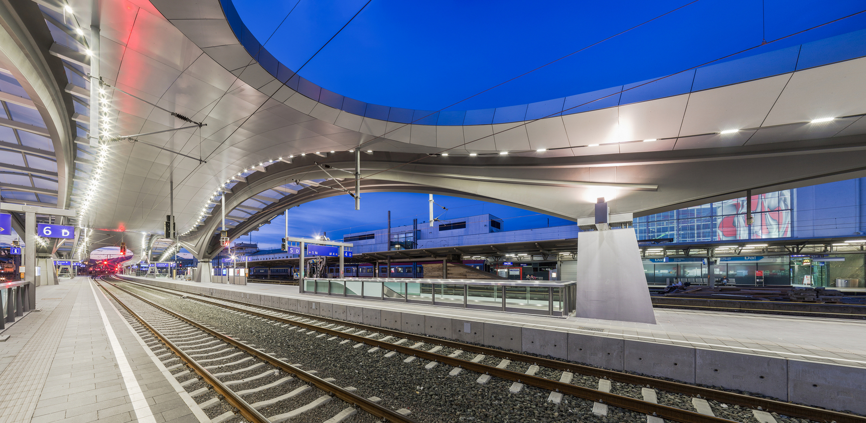 AE Interests: dynamic curved roof system, long two-span beam, reflects natural light, LED atmospheric lighting system for evening, prefabricated steel structure