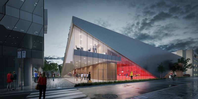 Multi-functional building, featuring a sports complex, swimming pool and facilities for graduations, exams, corporate and cultural events. Foyer entrance and mezzanine function space. Complex, angular facade. [a]