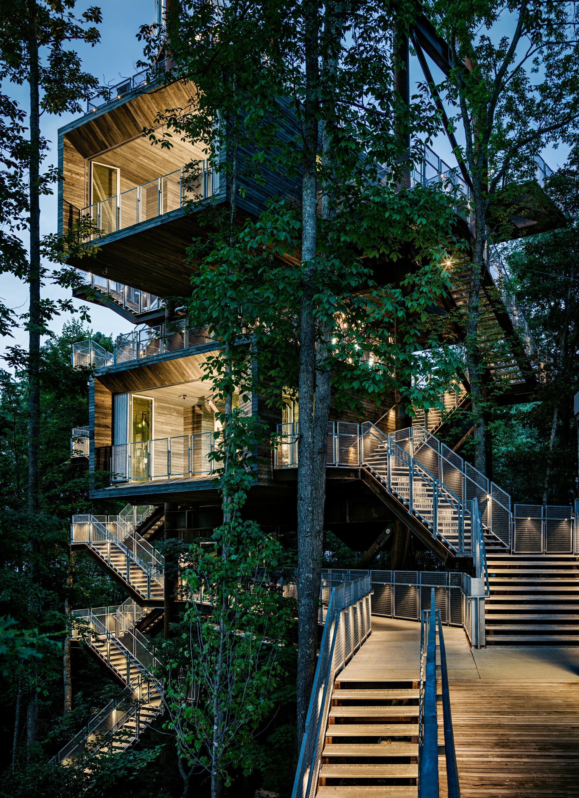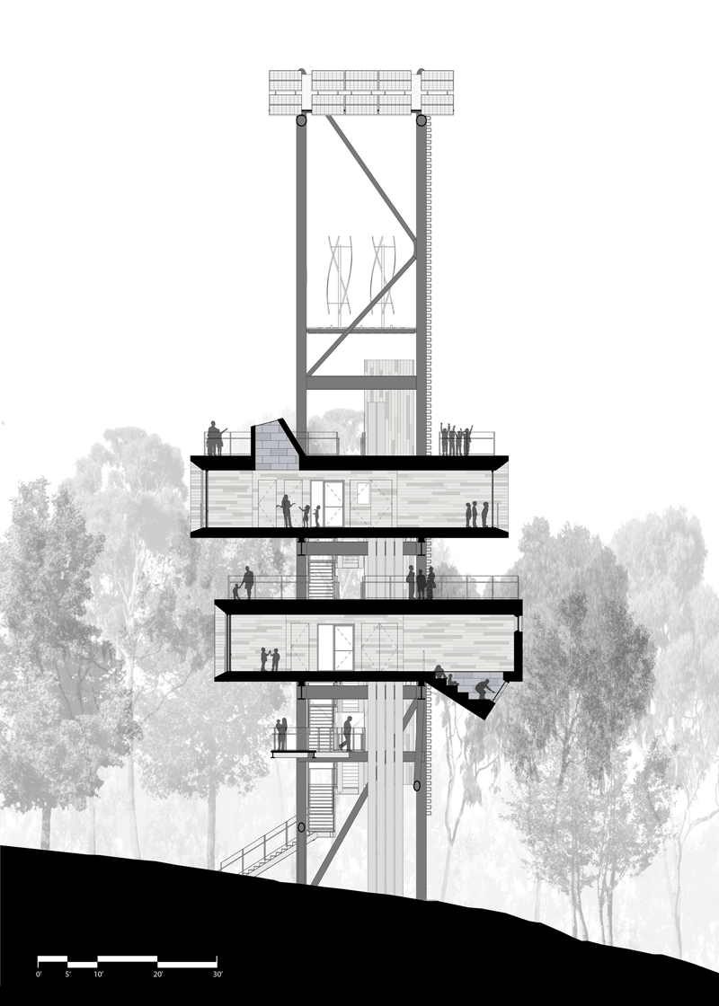Net-zero and on target for Living Building Certification. This building stands at about 125 ft tall and is supported by a Corten steel frame [a]. The forest canopy provides shading to the interior and galleries while the structure itself harvests solar energy and wind energy through the changing seasons. The Treehouse is designed to optimize natural lighting and 100% of the spaces are naturally cooled. No drinking water is used, only rainwater. Renewable energy sources include photo-voltaic panels, wind turbines, and a future central plant geothermal collector [b]. Locally sourced, and site-salvaged materials were used for construction. The naturally weathering materials significantly reduce the need for finishes, protect environmental quality, and minimize ongoing maintenance [a].