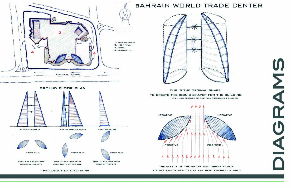 AE Interest: The Bahrain World Trade Center is the 1st skyscraper to incorporate wind turbines in the building design. The inspiration for the twin towers originated from regional “Wind Towers” and their ability to funnel wind, and the vast sails of the traditional Arabian Dhow. [a] There are three 95ft diameter turbines that are supported by three 103ft bridges that span the distance between the two towers. Each turbine generates 225 kw. The design and shape of the building allows the on-shore breezes to travel across the turbines and take advantage of 70% of Bahrain’s wind energy. [b]
