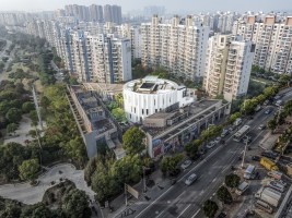 Micro cultural complex (ie. chess, library, coffee shop, offices, venue, museum). Tribute to ancient literati garden with roof vegetation garden. Contemporary Chinese courtyards. Curtain fencing wall using corrugated board, glazed tile, perforated aluminum (pattern is the pixel style of the “thousands of miles mountains and rivers”), aluminum grille with vertical green. Galvanized frame from original sales center building.