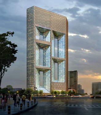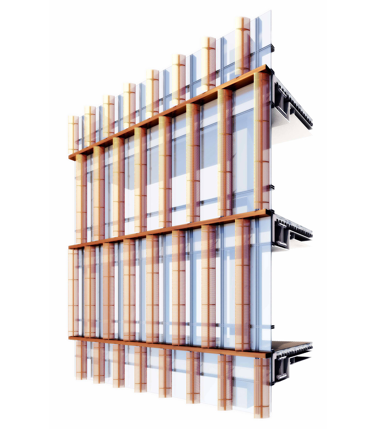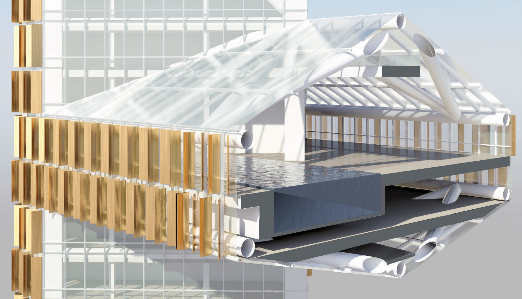 AE Interest: Vertical, copper cladded fin shading. Multi story sky bridges/lofts. Large wind breaks. Glazed roofs on sky lofts.
