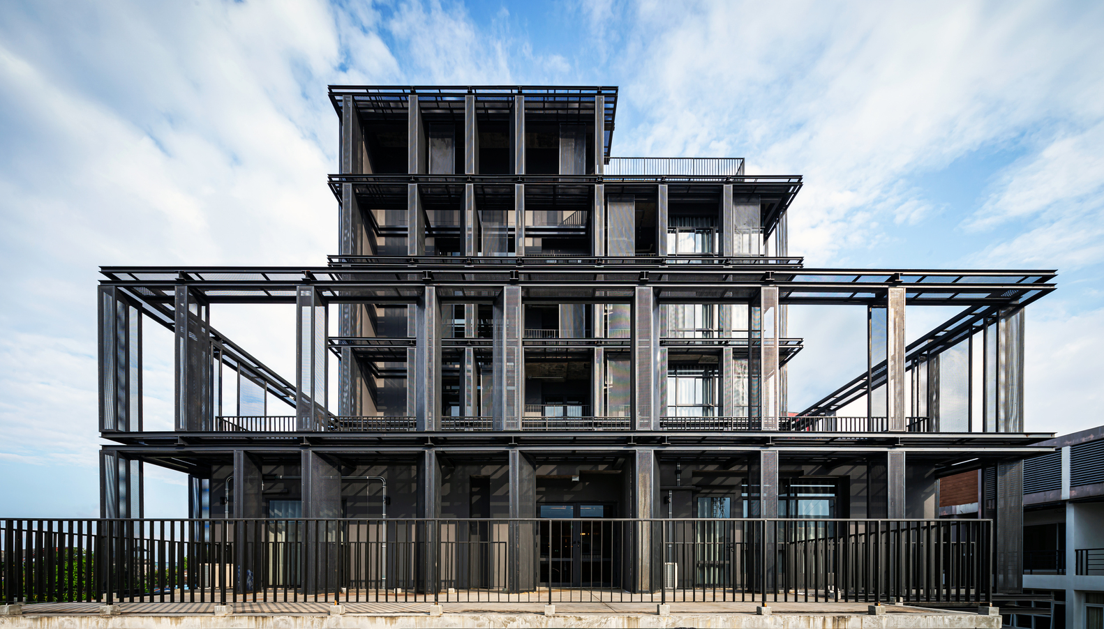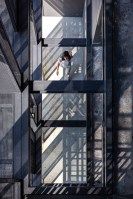 AE Interests: reinforced concrete structure, perforated metal to let light in, thin and sharp steel plates to melt the thickness of the building, use of steel, wood, cement, and rope