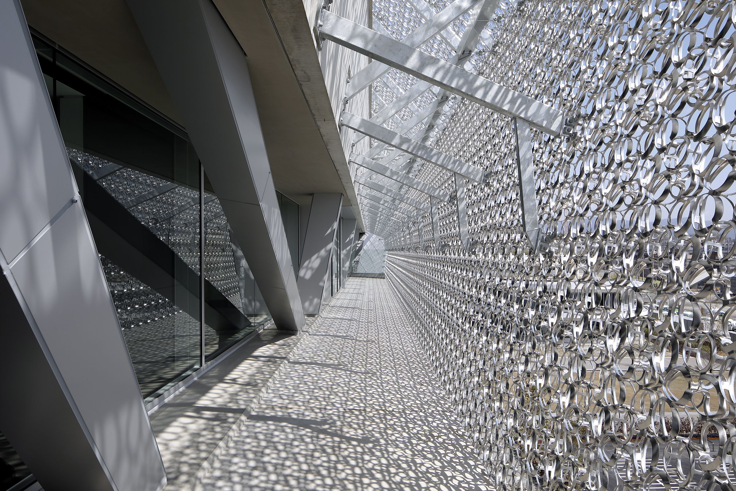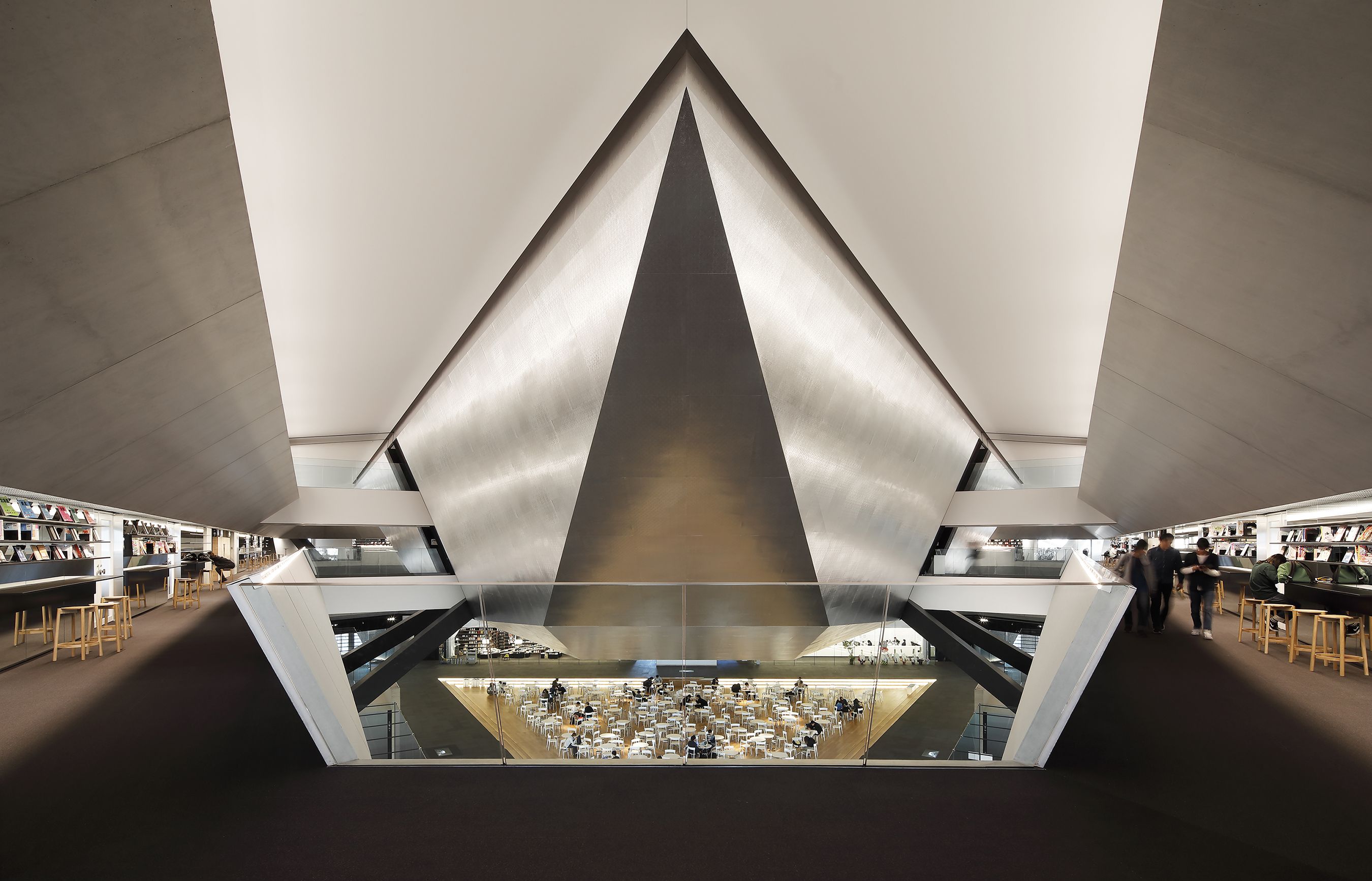 Inspired by ancient Japanese shrines (motif of cherry blossoms), triangular roof, floating library at the center, stainless steel exterior screens which reduce environmental load