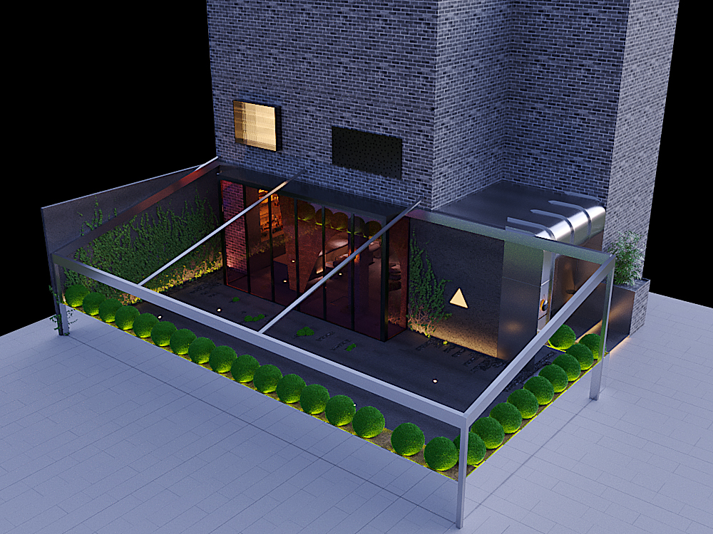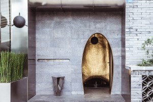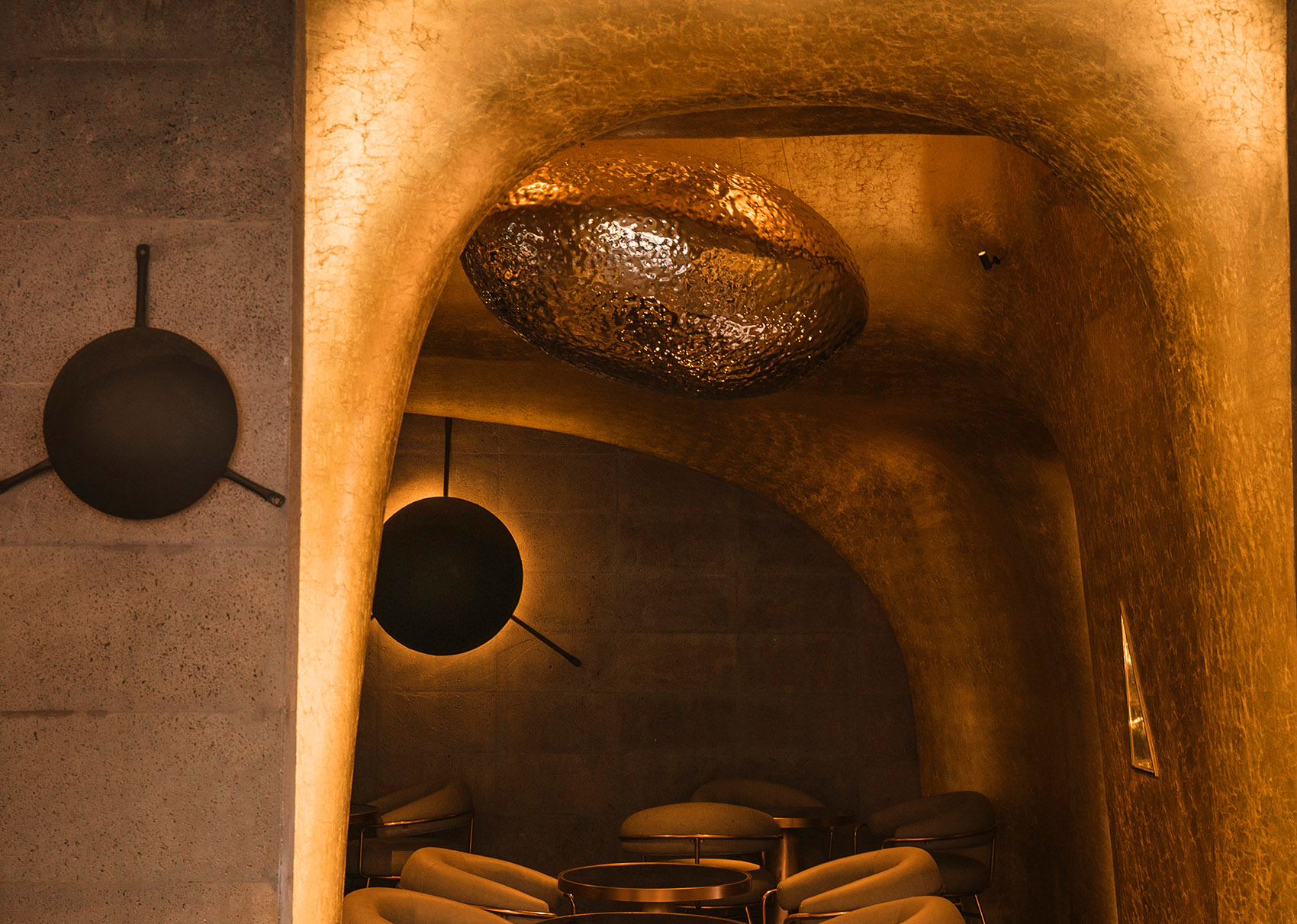 150 square meter (10.7 square feet), a lowered ceiling with organic curves and arches throughout, the interior is composed of leather and volcanic stone and covered in gold leaf, there is a small pond formed under a section of a floating wall spiked with whiskey