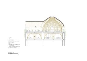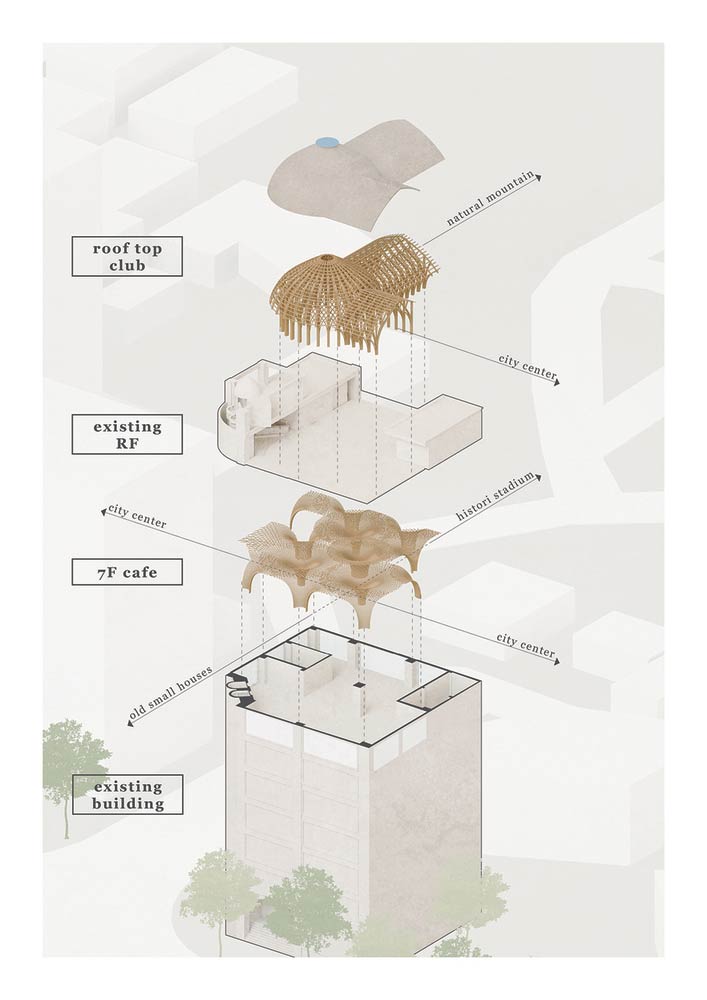 AE Interests: Icon of the City, renovated middle-rise concrete building, bamboo is a self-supporting structure, extremely long curved bamboo members, large dome, cave-like spaces, top floor café and rooftop club, interweaving bamboo ceiling, extensive view of city, recognizable space from the street.