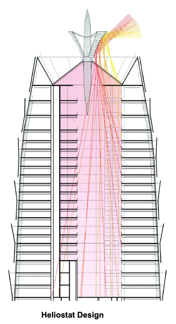 AE Interest: Tallest building in central China when completed, shape reflects circular manmade lake, pagoda inspired structural system, hotel/office space, 18-story atrium, tilted louvers enhance interior daylighting reducing artificial lighting, smart-control system utilizes wind pressure and stack effect for ventilation, low-E glass, heliostat maximizes natural light reflection into hotel atrium.
