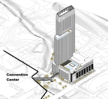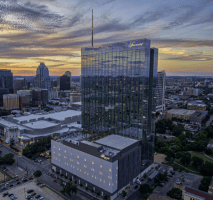AE Interest: 3rd tallest building in Austin, sky bridge that connects the tower’s second level with the Convention Center across Red River Street, targeting LEED Gold certification with high-performance exterior façade shading devices, rainwater harvesting and guest room occupancy monitoring.