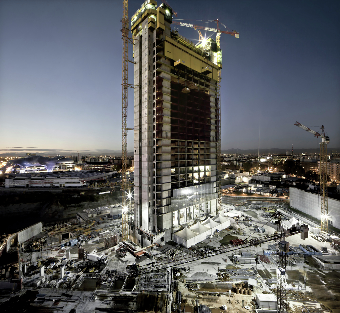 50 floors, 686ft tall, 878,500 sf, LEED Gold, cold bent triple glass curved façade, external struts reinforcing slender structure against wind, a part of CityLife, 8 modules of curves, short sides are glazed showing elevators going up and down, tallest building in Italy (including spire)
