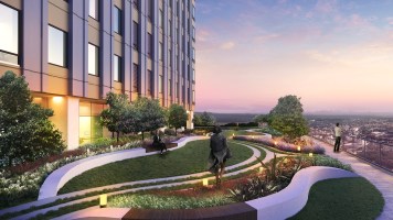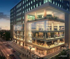 538 feet tall office building, 90,847 sf lot, post-modern, concrete, terrace garden, landscape decks, sky park, sustainable, LEED certified, eco-friendly, punched windows