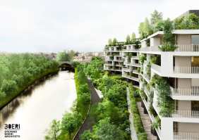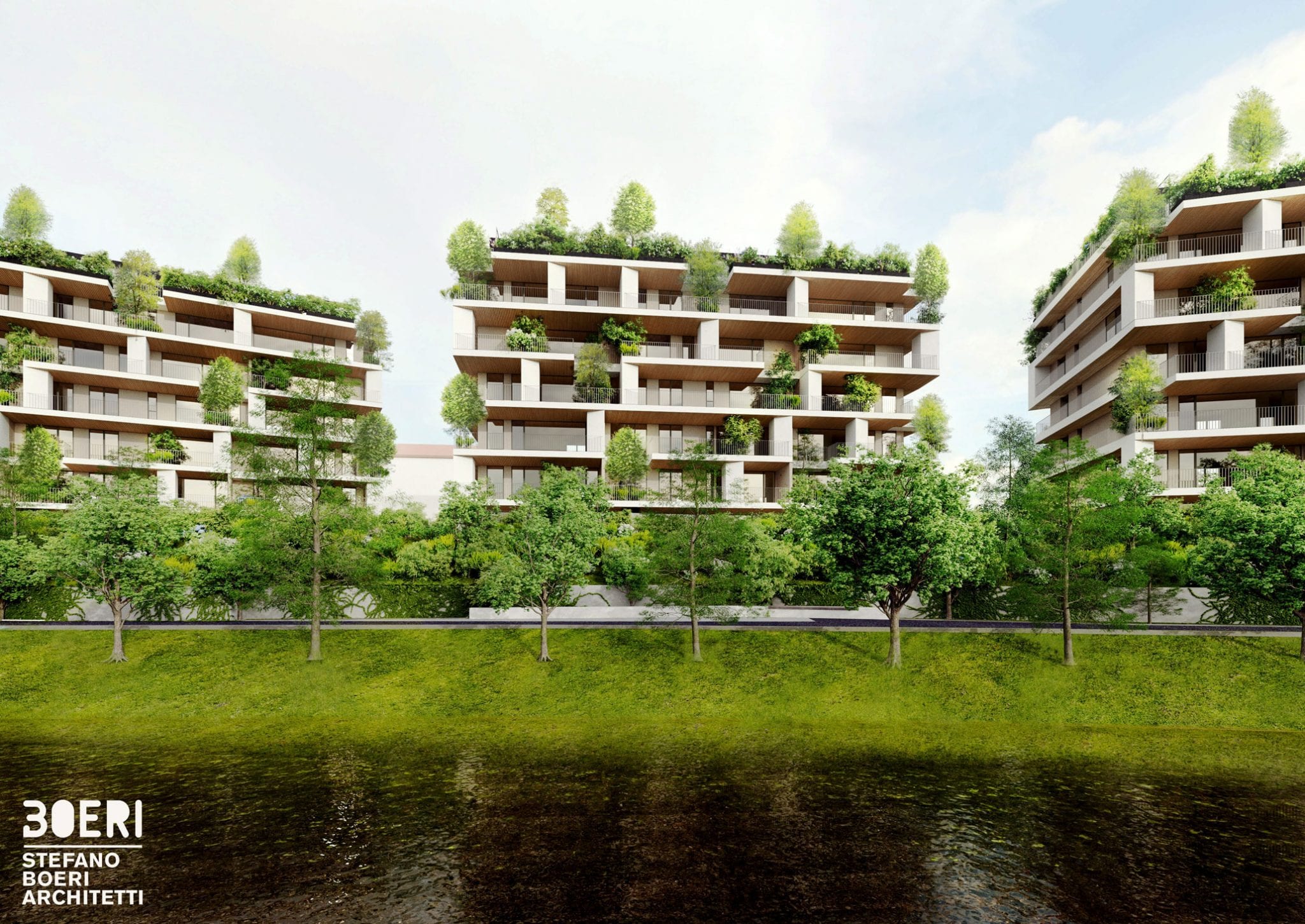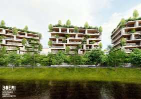 AE Interests: residential “urban forest,” “zero-impact” complex, exterior appearance changes with the seasons, adaptive reuse of old industrial site, trees and bushes produce over 2.7 tons of oxygen per year, Wienerberger brick insulation.
