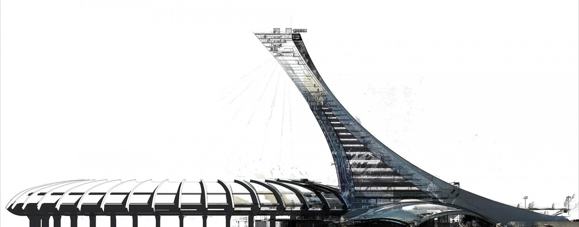 AE Interest: Tallest building in the world at 45 degree angle, 165 m tall (541ft) , suspension cable stadium roof support , glass curtain wall , 3 curved facades