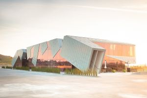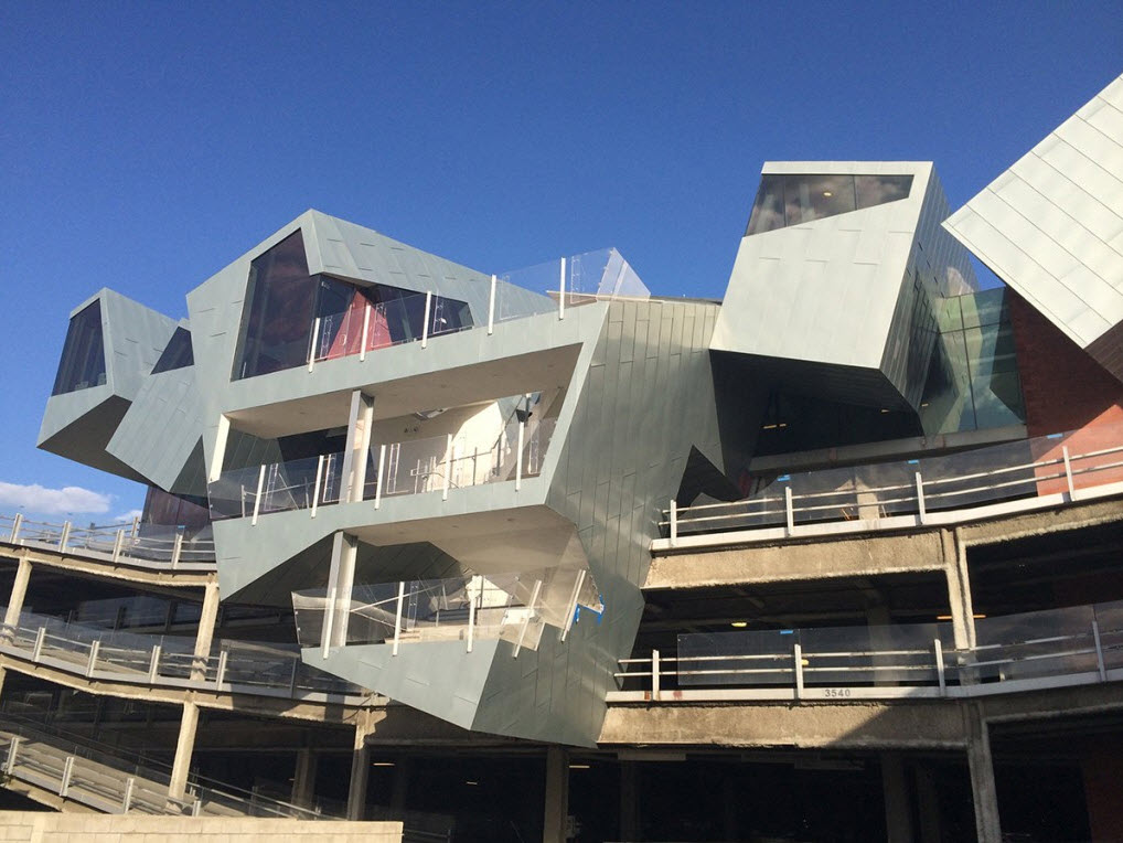 AE Interest: Cantilevered sections, open floor plan with private spaces, pre-existing parking structure add on , abstract design, nine boxes stacked on top or adjacent to each other, high-performance glazing, steel reinforced aluminum mullions, interesting façade.