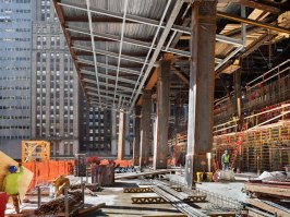 AE Interests: 73 floors, 1301 (396.5 m) ft. tall, 100 (30.5 m) ft. spire, 735,500 sf (68000 m2 ) of curtain wall, no perfectly vertical steel column below highest occupied floor, 4,000 sf transit hall (subway), 1.2-MW cogeneration system, 50,000 gallon rainwater collection, water and air side economizer, highest level of LEED and WELL certification
