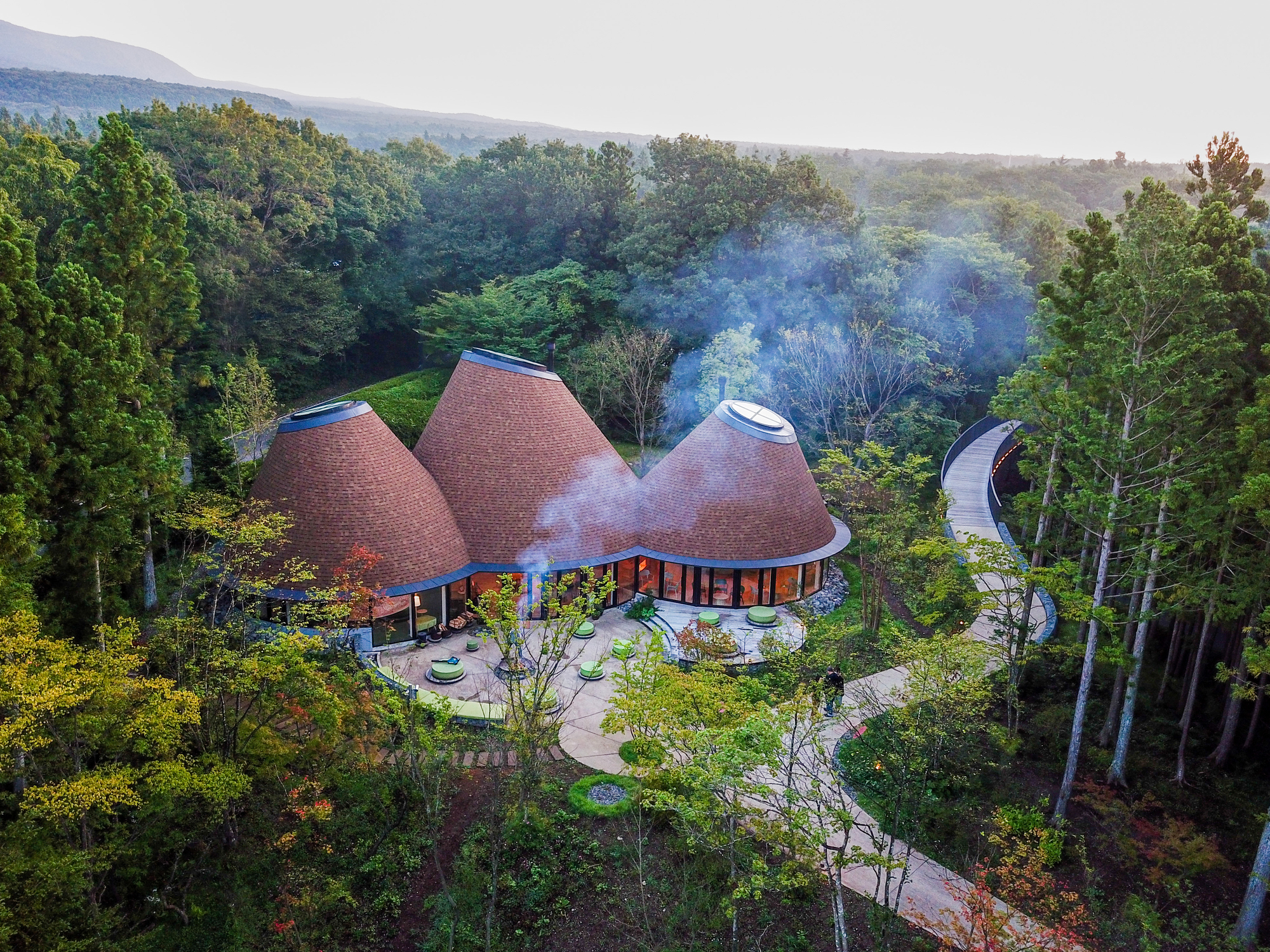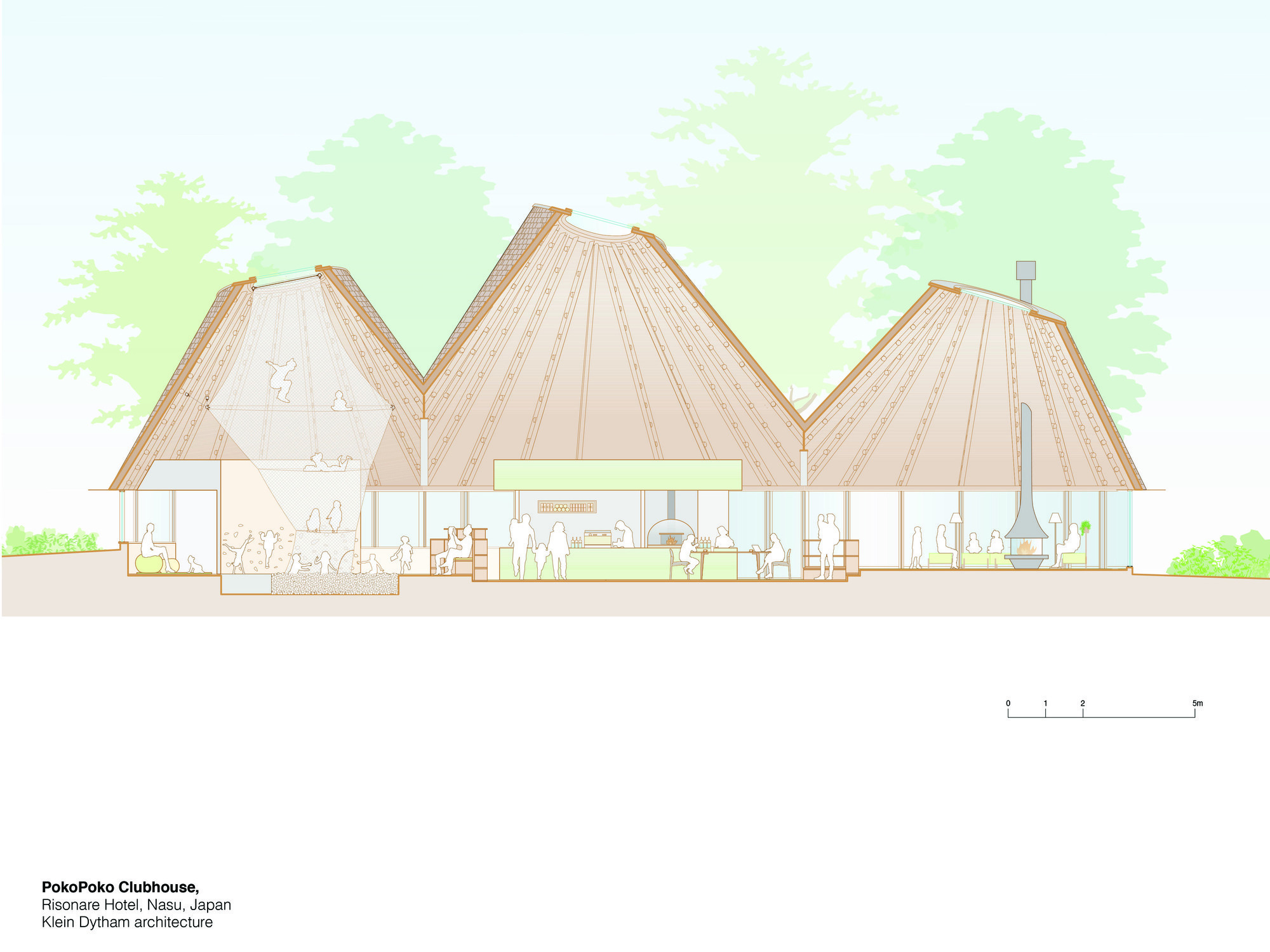 AE Interests: 300 square meter area, fairytale inspired, strong 3 cone concept, local pine roof, upper and lower steel rings to create skylight, ‘doradora’ furniture made by Klein Dytham, each space has individual program, 360 degree views.