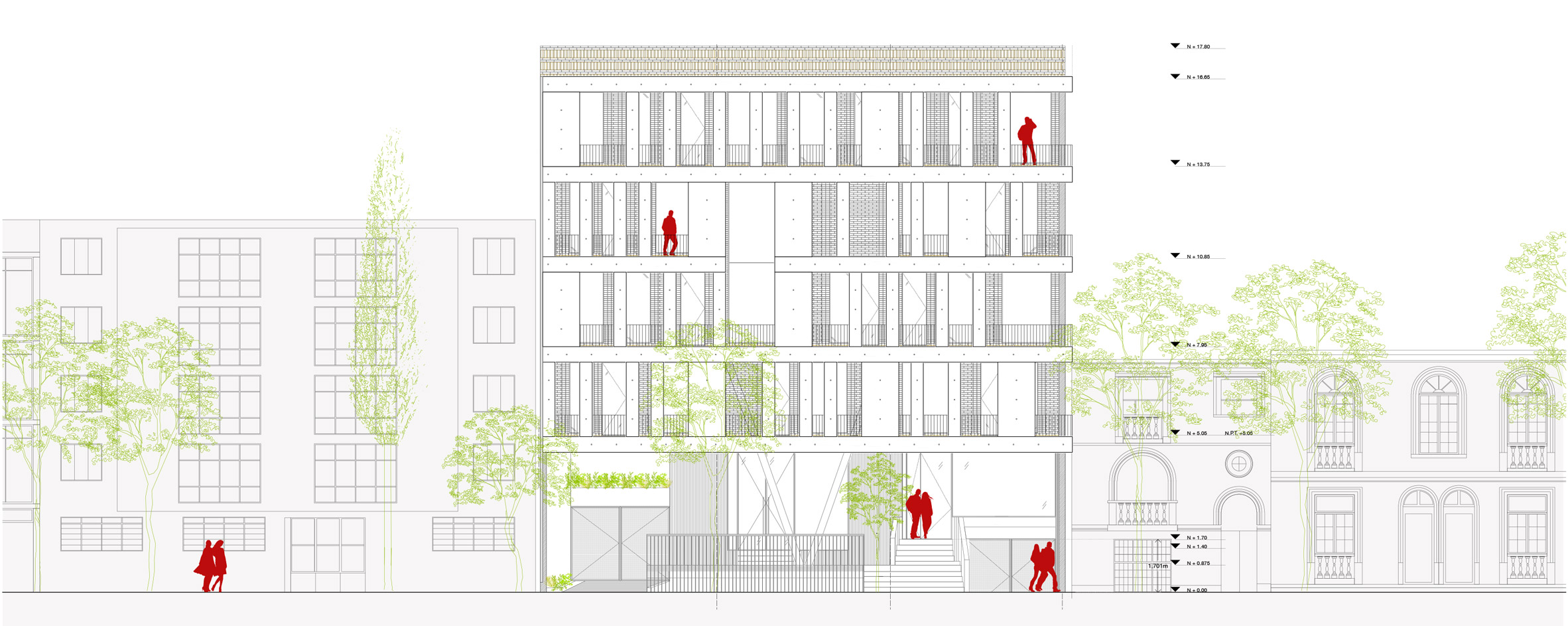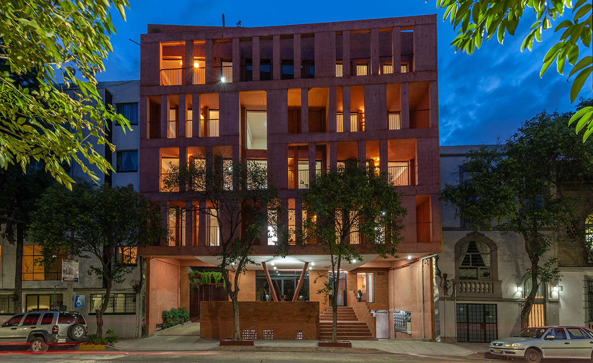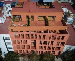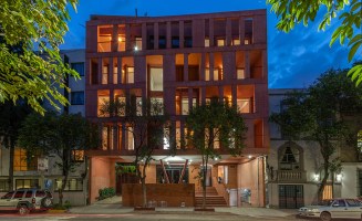 2800 sq. meters, 2 levels of parking at base, 5 levels of apartments above, made of local materials, double skin exterior: inner layer red brick, outer layer/screen tinted concrete, external screen mitigates solar heat gain and promotes privacy, variety of light wells, terraces, balconies, outdoor stairs to help bring in natural light and ventilation