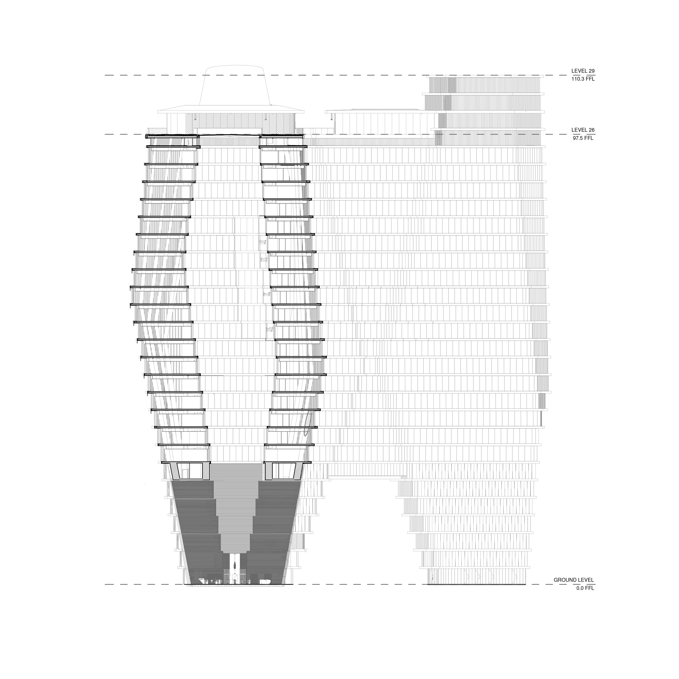 53,000 sq. meters, inspired by iceberg, small footprint on ground, widens in middle, plaza on ground floor, floor plan varies for all 28 floors, lower levels clad in knitted design Dekton for ventilation and structure, MEP on lower floors, energy saving and intelligent facade system, LEED Platinum certification, the first of two future conjoined towers, second tower expected to be completed by 2024