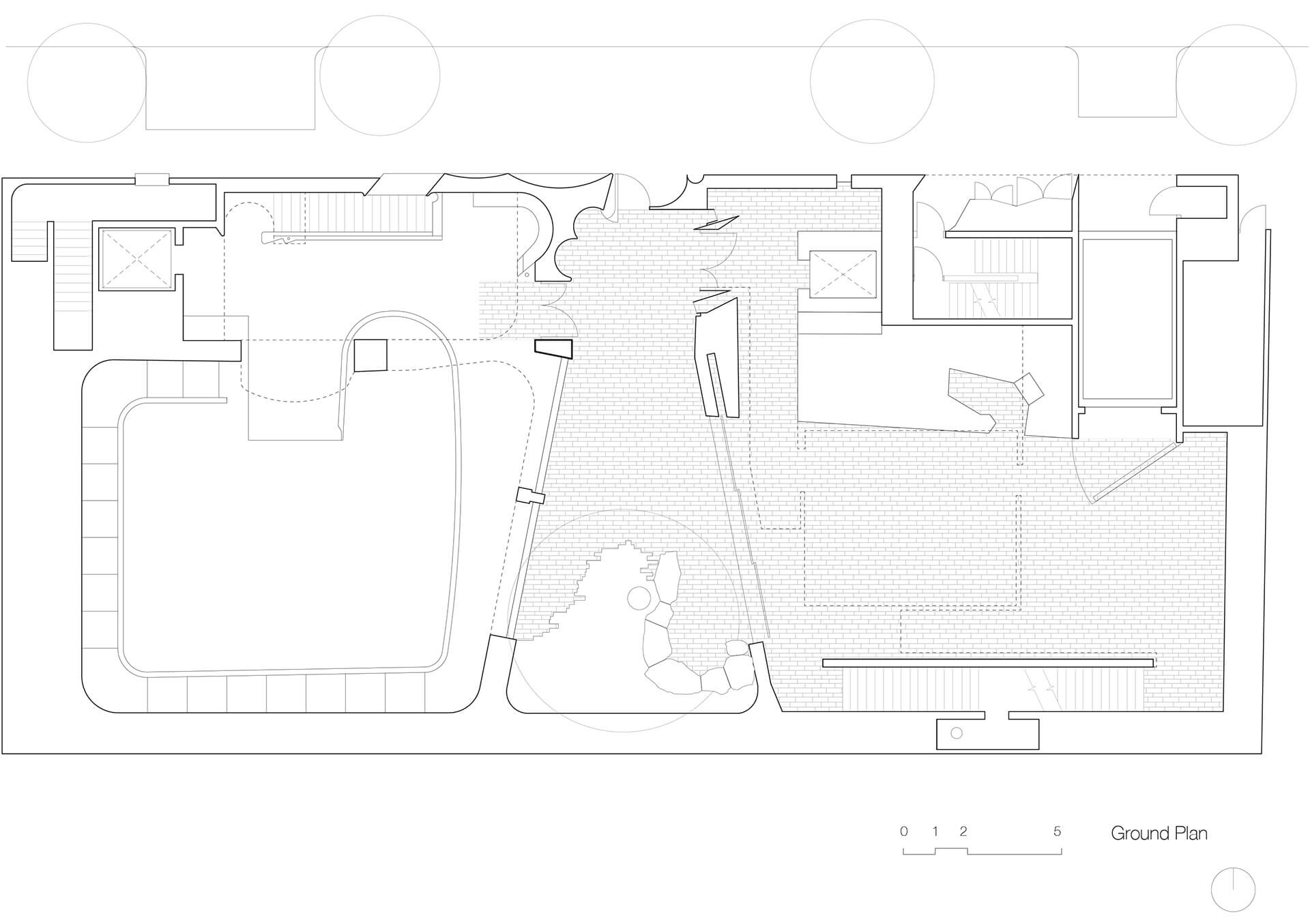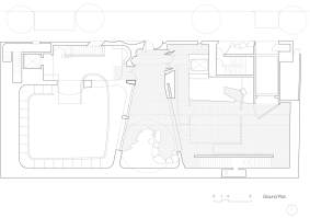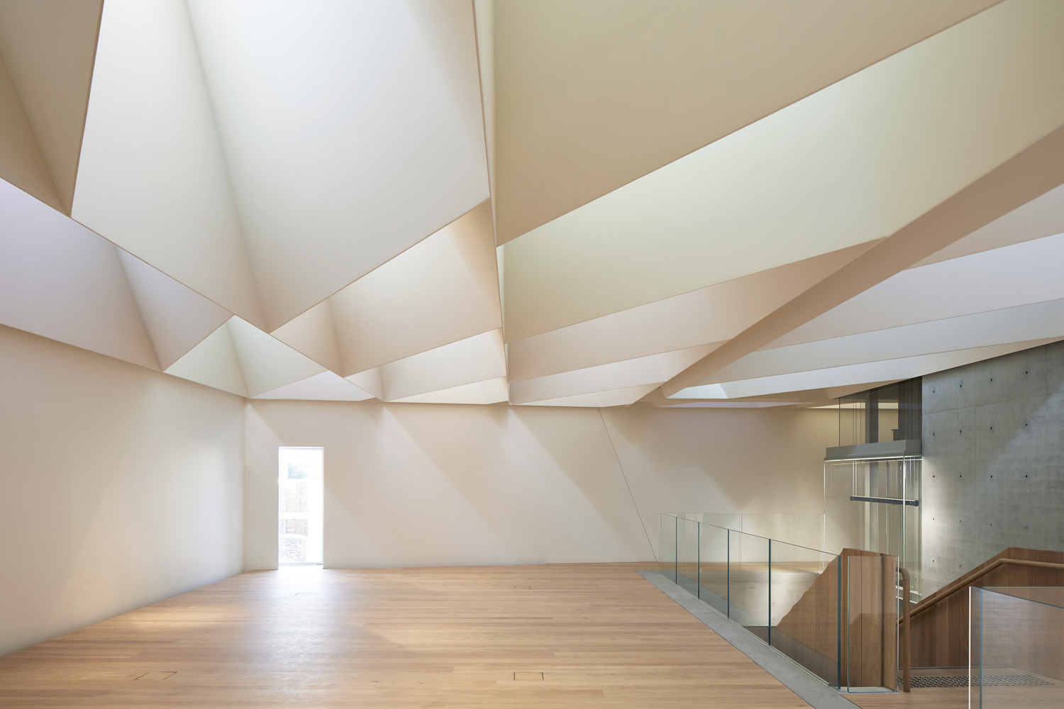 Concrete gallery walls, timber performance space walls, 5 stories, linking nature and art, multiple gardens, large and small spaces, flexibility in functions, geometric skylights, complex volumes connected by stairs and bridges