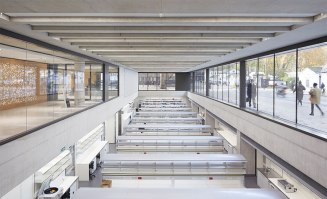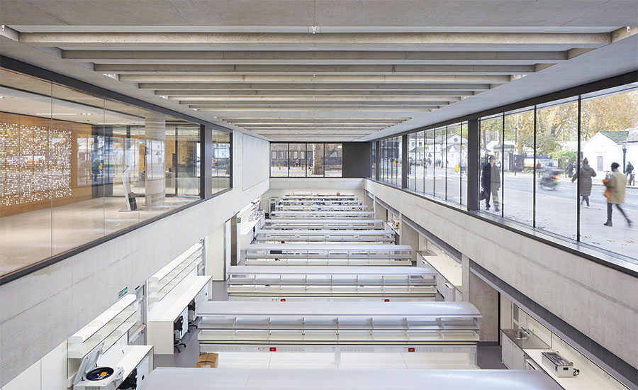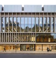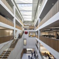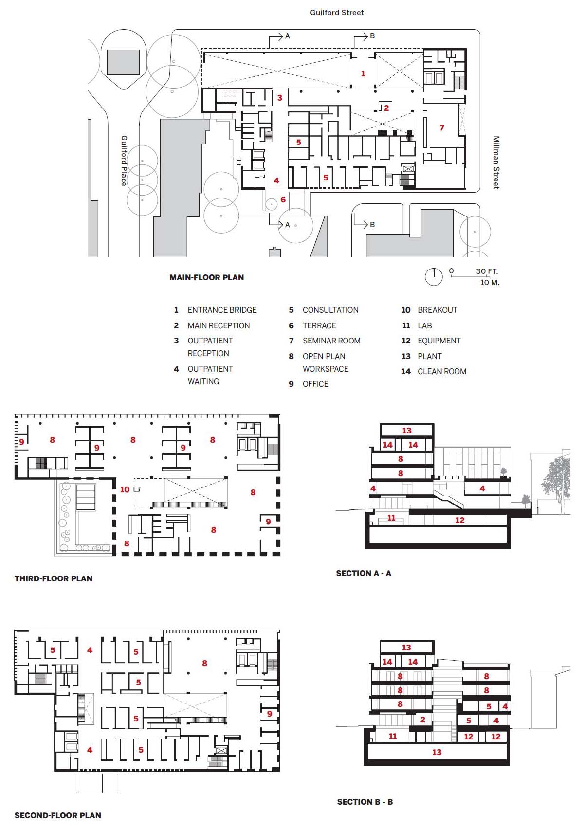 First purpose built pediatric center, large sky-lit atrium w/oak staircase, glass and terra cotta facade, impressive finned terra-cotta screen shielding glass walls, 8-story concrete structure, post-tensioned slab with wide spans, moving interactive sculpture in the main entrance, visible laboratories from all sides