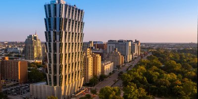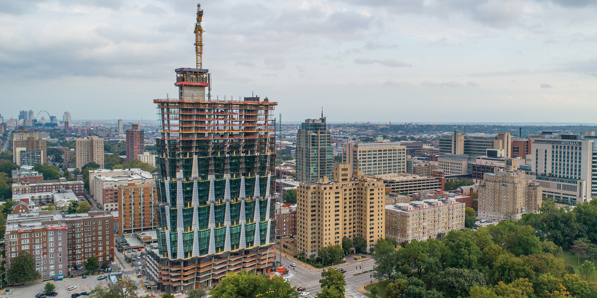 AE Interests: Green Globe Certified, leaf-shaped plan, green roof rainwater storage, overlooks Forest Park, scalloped façade, tilted glazing, tallest residential building in St. Louis