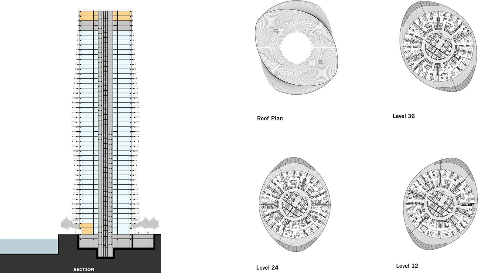 AE Interests: 366 residential units, all units have cantilevered balconies that are elliptical in plan, the balconies vary in size and rotate slightly as levels rise to create the tower’s distinctive flowing twist, building shape offers solar shading for each level,